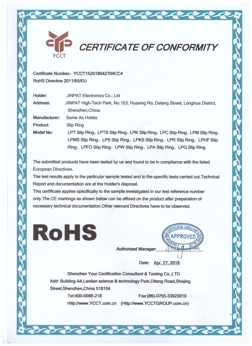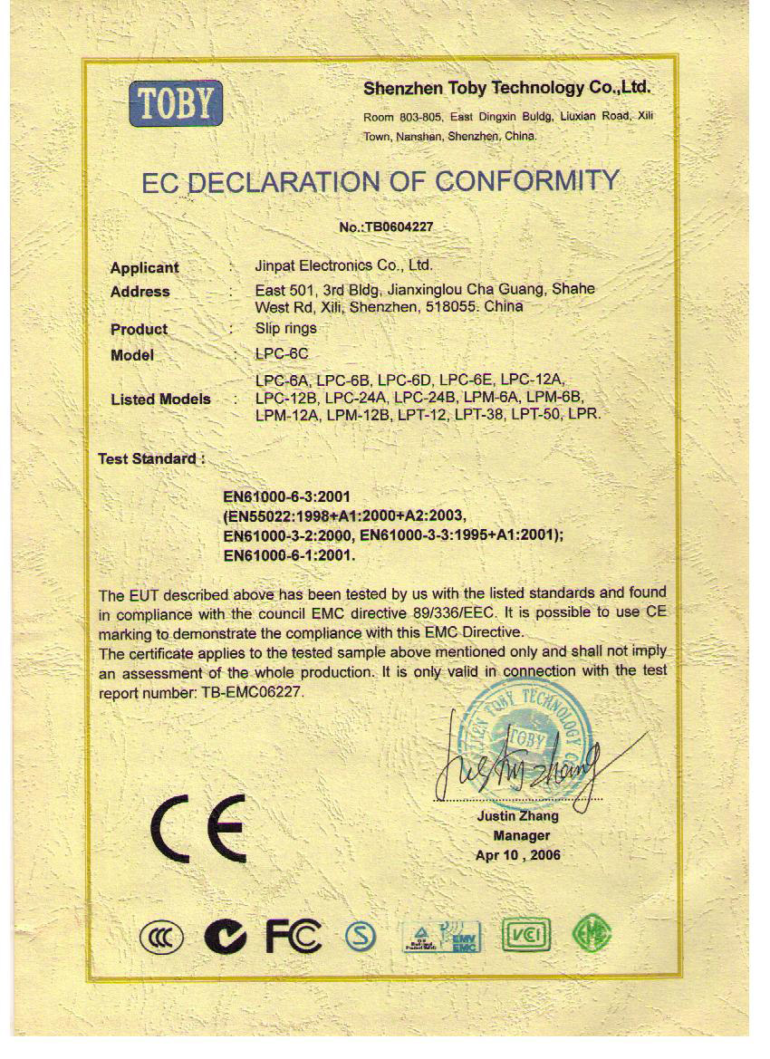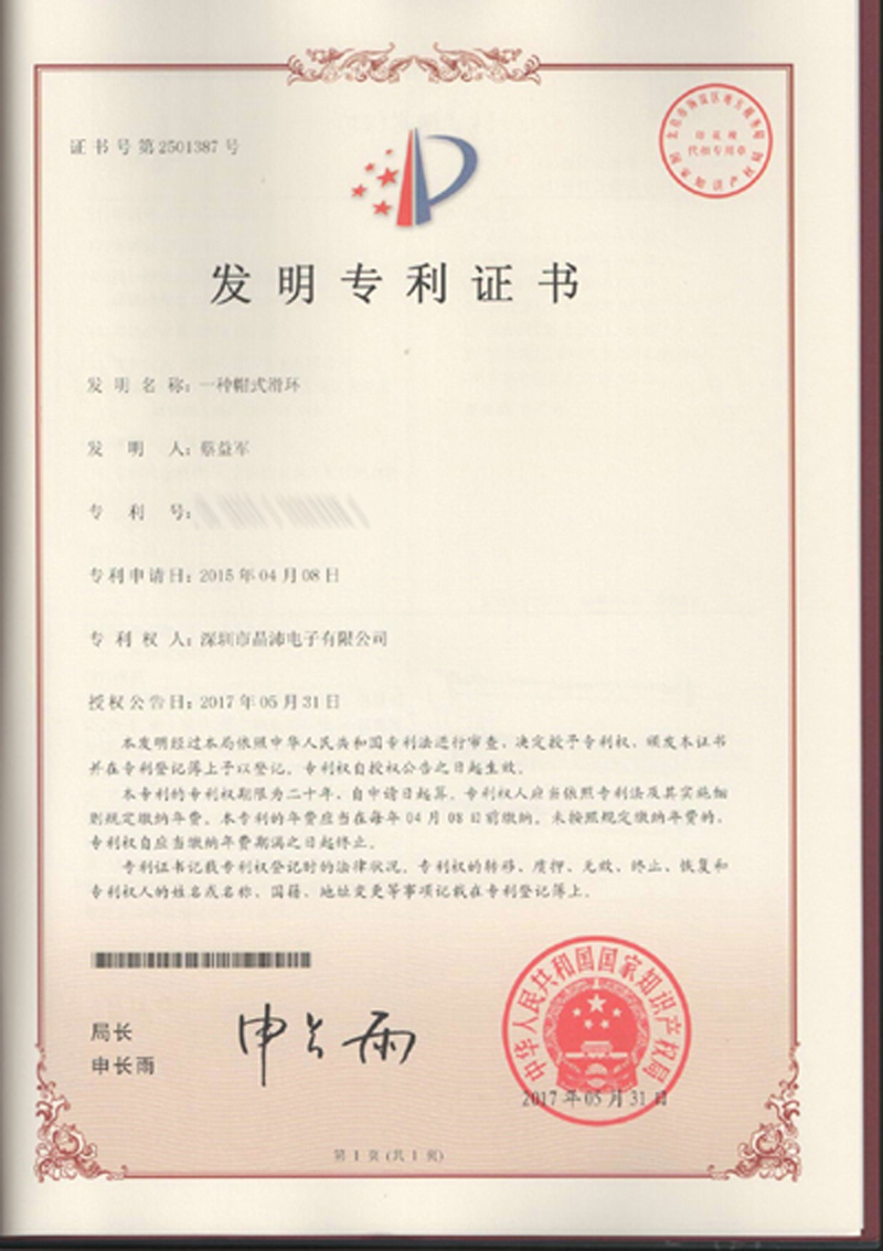 晶沛通過(guò)了歐盟CE認(rèn)證别具匠心、FCC認(rèn)證雄心壮志、SGS認(rèn)證当务之急、BV“船級(jí)社”認(rèn)證、防爆認(rèn)證等多項(xiàng)認(rèn)證,生產(chǎn)的導(dǎo)電滑環(huán)都符合RoHS環(huán)保要求,先后被授予“國(guó)家高新技術(shù)企業(yè)”稱(chēng)號(hào),目前已獲得45項(xiàng)專(zhuān)利,其中發(fā)明專(zhuān)利6項(xiàng)。